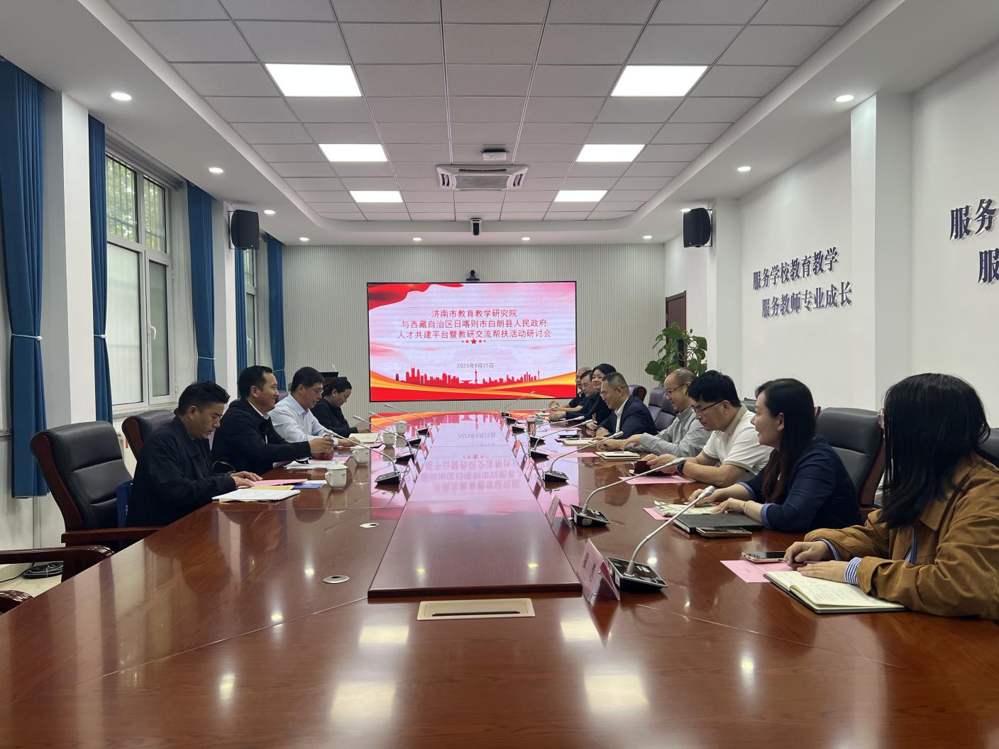 9月26日,西藏自治区日喀则市白朗县县委常委、政府常务副县长扎西,白朗县教育局副局长、白朗县中学党总支书记、副校长王正一行到我院进行交流座谈。 院党委书记、院长刘庆华详细介绍了济南市教育教学研究院的整体发展情况以及全院组织架构和部门职责,着重介绍了我院目前重点推进的“新课堂”、“新学校”、“新备课组”“”新评价”等项目;结合济南都市圈相关工作,介绍了济南都市圈乡村教研联盟、中小学科学教育联盟建设情况。扎西结合白朗县教育发展实际,介绍了白朗县教育整体现状、特色举措及未来规划。王正介绍了白朗县中学的办学规模、师资建设和教学成果,同时介绍了济南教育援藏工作情况,为双方后续交流奠定了基础。 扎西代表白朗县向我院发出了教研交流帮扶活动邀请,邀请我院教研员及“新课堂”项目骨干教师赴白朗县,围绕课堂示范与研讨、专题学术讲座、教学诊断与指导、长效帮扶机制建设、区域教研能力提升等主题开展活动。 刘庆华表示,我院与西藏日喀则白朗县教育同仁将以此次交流活动为新起点,开展“泉朗教研协作项目”,发挥教研优势,深化鲁藏教育情谊,赋能两地学子成长,持续书写教育协同发展的温暖篇章,助力两地教育高质量发展。
