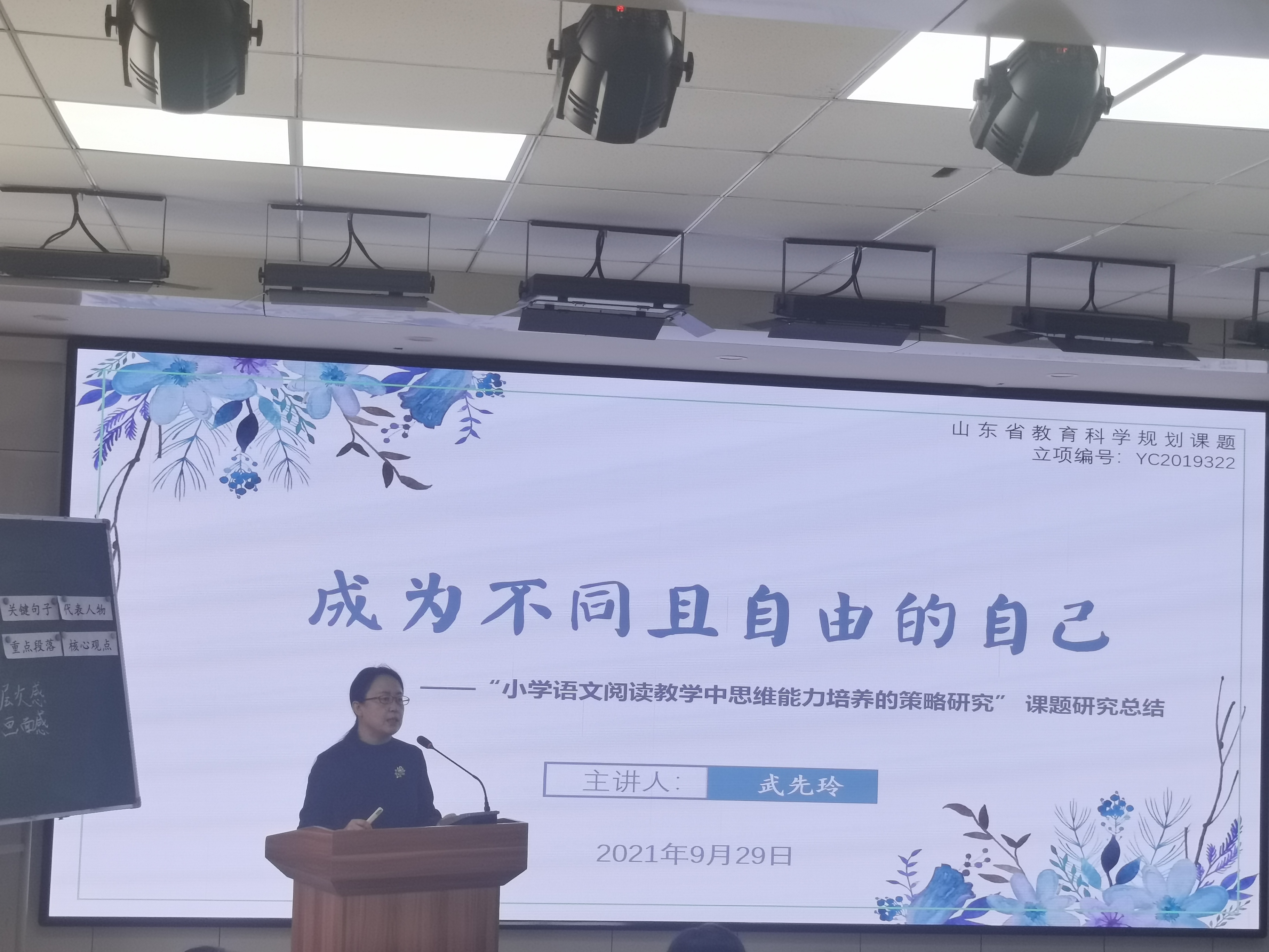 本次活动也是课题研究总结会。济南市教育教学研究院小学语文教研员武先玲以《成为不同且自由的自己》为题,对课题研究予以总结。通过研究工作回顾、概述研究成果、反思研究历程以及期待未来四个方面的梳理,就课题研究历程、成果进行了总结反思,期望济南小语人在以后的教育教学、教育科研中以“系统思维”的方式全面深入的思考,有意识地培养自己以“点、线、面、体”逻辑闭环的方式进行表达,以“理论实践相互印证”的行动方式去践行教育科研,真正成为不同且自由的自己。