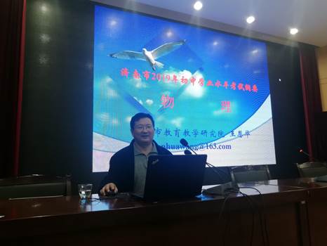 王恩华老师从命题原则、考试内容与要求、考试形式及试题结构和题型示例等四个方面向参会老师解读了大家最为关心的物理学科考试纲要。根据济南市2019年初中学业水平考试工作“稳中有变”的总基调,物理学科命题依然坚持“以能力立意为主、注重考查学科核心素养”的命题原则,在2018年的基础上保持相对稳定。考试内容与要求严格按照《义务教育物理课程标准(2011年版)》且不拘泥于教科书,通过简单实际情境突出对学生具备的初步的观察及提出问题的能力、初步的信息收集能力、初步的分析概括能力、初步的信息交流能力及分析问题和解决问题的能力等的考查。从考试形式上延续2018年学考考采用的“理化同场分卷、闭卷笔试、网上评卷”的形式,试题结构与2018年基本相同。在题型示例的解读中,突出强调了学考试题的考查要求及物理学考命题对物理教学的引领作用。