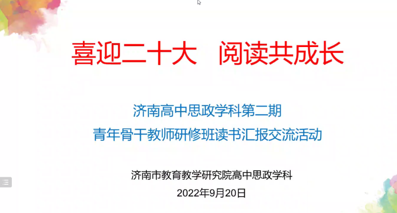 为促进青年骨干教师研修班学员的快速成长,激励青年教师从优秀著作中汲取营养,学以致用,以优异成绩迎接党的二十大胜利召开,9月20日上午,济南市高中思想政治学科第二届青年骨干教师研修班学员举行读书交流活动。活动通过腾讯会议方式举行,由济南市挂职教研员刘磊主持,第二届青研班全体学员参加。 研修班学员围绕“喜迎二十大,阅读共成长”这一主题交流读书心得,进行思维碰撞。历城二中张治薇、山东师大附中周金凤、平阴实验中学于雯雯、高新区实验中学杨长华、济南中学王珊珊、商河二中刘培喜、历城一中郑盈等7位老师分别围绕让学习真正发生、做学生人生中的一簇光等主题作了精彩的分享交流。 刘磊老师对活动进行了总结,指出阅读是教师智慧的源头,我们可以从阅读中寻求教育思想的源头、教育智慧的源头。每一位老师应该广泛阅读,更好地担负起立德树人的使命。 市教研院黄万强老师对所有分享交流的老师表示感谢,同时对青研班下一步工作进行了布置。黄老师表示,青年教师的茁壮成长就是我们推荐阅读书目、开展交流活动的最大价值所在,希望广大青年教师在勤于学习、善于思考、敢于创新的路上不断追寻教育梦想。 “最是书香能致远,唯有读书方宁静”。本次读书汇报交流活动为青年教师重新审视读书的意义打开了一扇窗,必将激励并帮助研修班学员及全体青年教师不负重托,以青春之我,创造青春之学科,青春之教育。(高中思想政治)