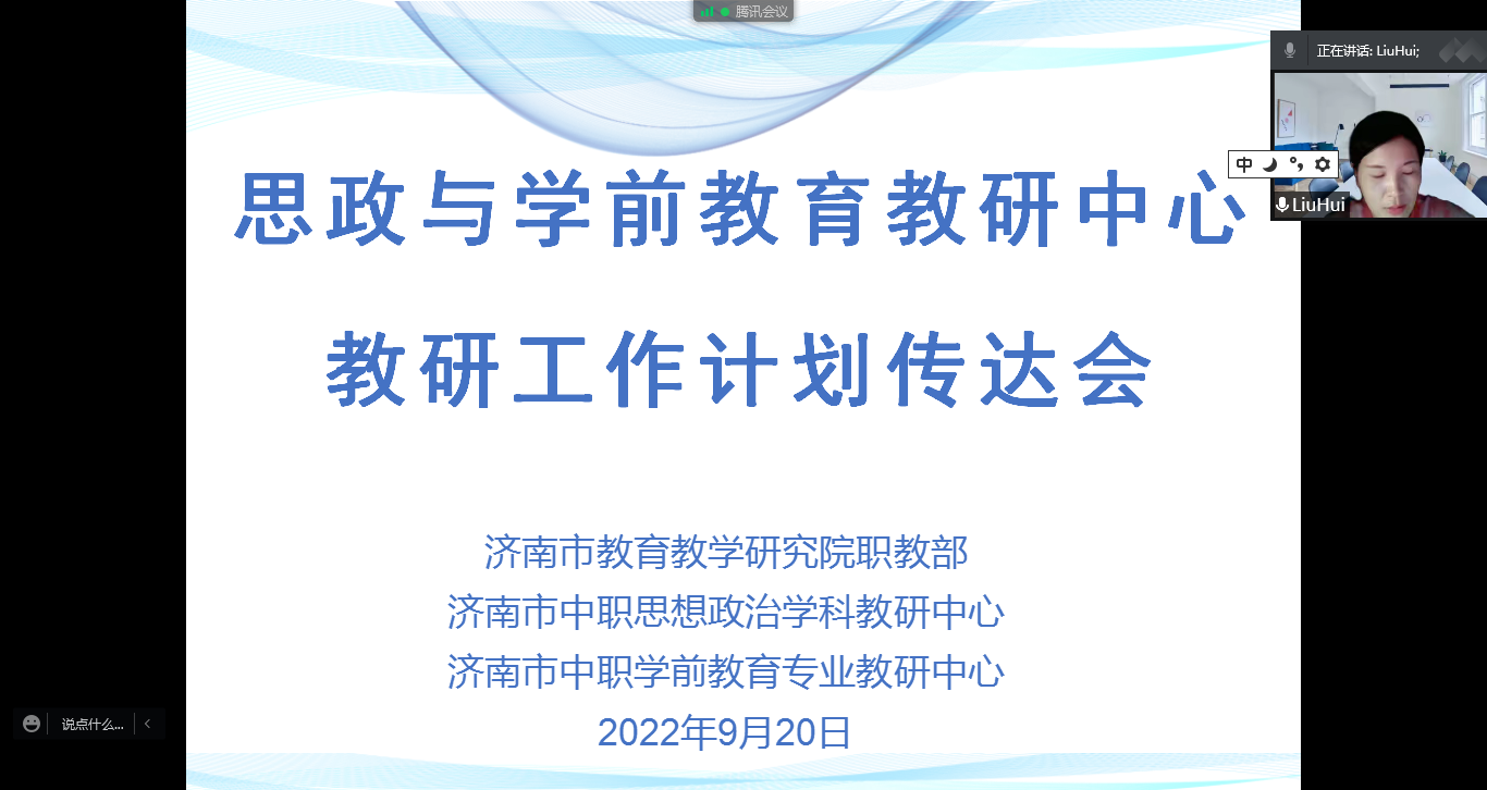 9月20日下午,济南市中职思政学科与学前教育专业教研中心联合召开教研活动并传达2022年下半年教研工作计划。济南市教研院中职思政学科和学前教育专业教研员刘慧、济南市中职思政学科和学前教育专业中心组成员、各中职学校思政学科和学前教育专业教研组长及骨干教师参加了本次教研活动。 本次活动采用腾讯会议的形式,由济南市中职思政教研中心副主任苗成义主持。会议共分三个阶段:第一阶段由市教研院教研员刘慧就暑假到现在思政学科和学前教育专业开展的各项活动进行了总结,同时对本学期思想政治学科和学前教育专业教研工作计划进行了传达。刘慧老师结合已经结束的思政理论课教学比赛、中职班主任能力大赛、中职教师教学能力比赛等活动,对两个中心老师的表现给予了肯定,对老师们的执着精神和认真负责的态度表示赞赏。对本学期即将开展的名师送教送研、议题式教学教研、联合普高共同教研、幼儿保育专业技能大赛、学前教育专业联合命题等工作进行了部署安排。第二阶段由济南市中职思政教研中心副主任苗成义就本学期思想政治教研中心教研工作计划进行了传达,并对《中国特色社会主义》和《哲学与人生》授课进度进行了解释说明。第三阶段由济南市学前教育专业教研中心副主任郝玲就本学期学前教育专业教研中心教研工作计划进行了传达。 本次教研活动对本学期教研工作进行了详实全面的安排部署,与会老师一致认为,通过本次活动明确了本学期教研工作的指导思想,找了教研工作的总抓手。思政学科和学前教育专业教研中心将继续在市教研院职教部的指导下以立德树人为根本任务,以培育学生核心素养为抓手,不断提升研究与服务水平,提高教育教学质量,以实际行动迎接党的二十大,培根铸魂育新人。(职教部)